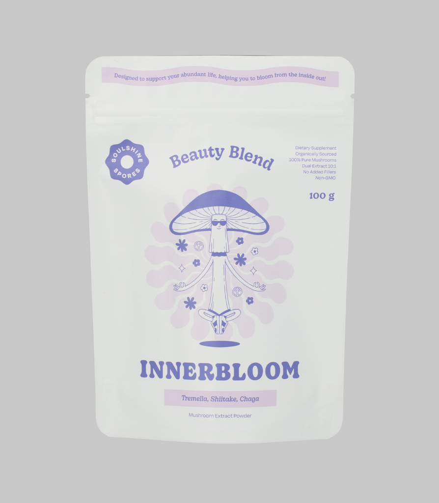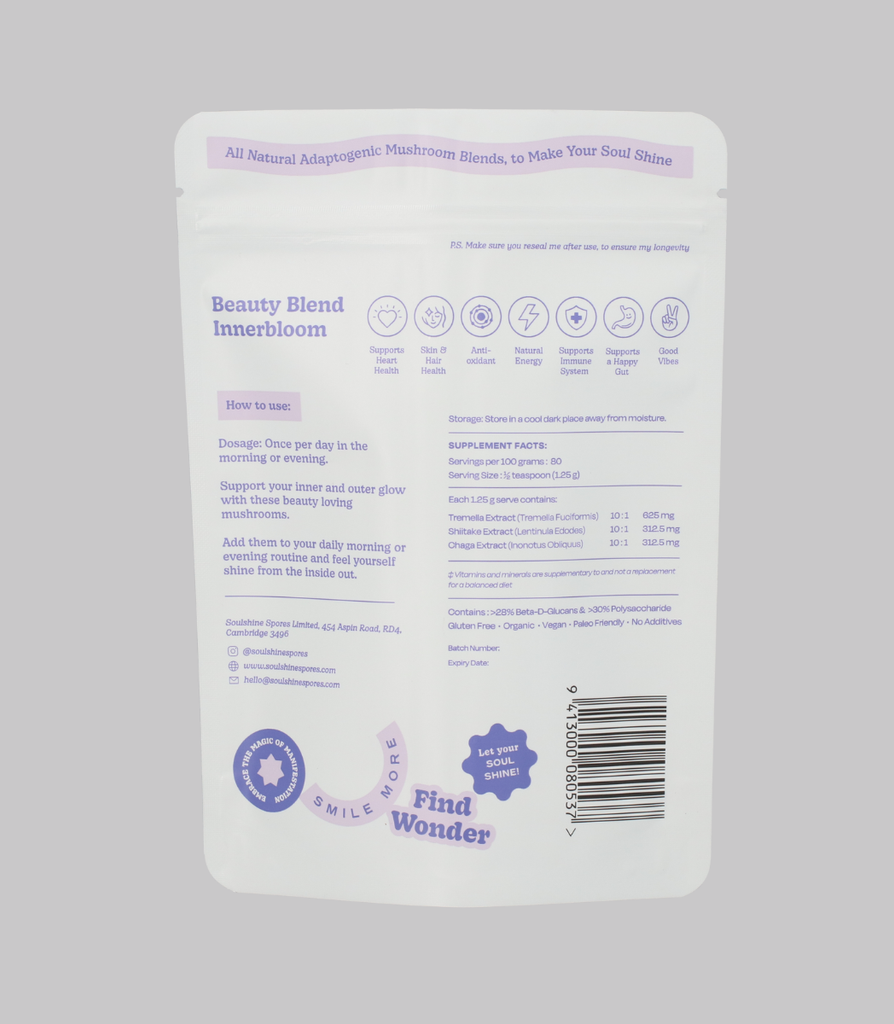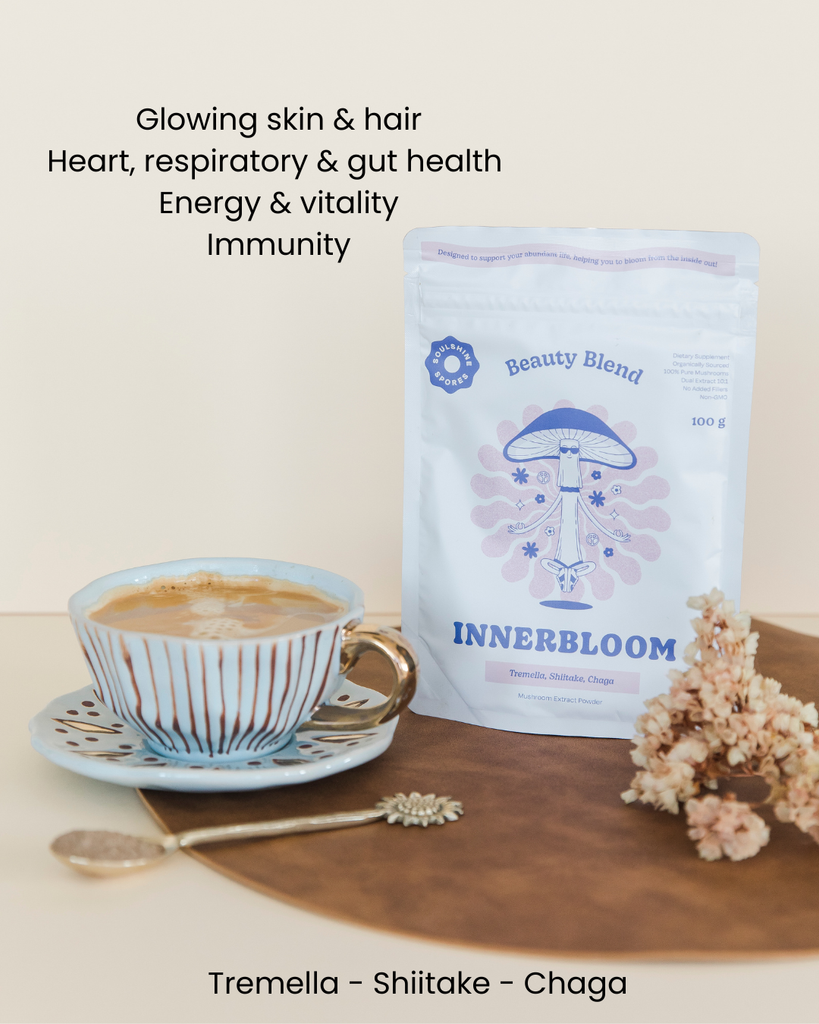 Support your inner and outer glow with Innerbloom, a special medicinal mushroom blend of tremella, shiitake and chaga. Full of antioxidants to promote glowing skin and healthy hair, to support immunity, digestive health, the respiratory system, boosting energy levels and overall wellbeing.